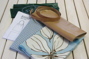 次はいよいよ生地選び。肩にかけられるタイプのバッグにしました。ビニールコーティングされている生地は芯を貼らなくてもしっかり作れる優れもの。