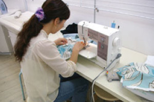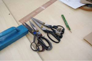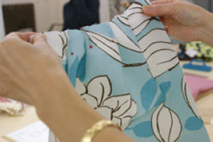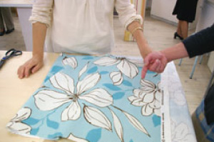 柄の出し方のアドバイスをもらい、型紙に縫い代を付けてt生地を裁ちます。 生地を裁つ時の地の目の取り方など大切なポイントを丁寧に教えてもらいました。