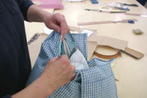 私も頑張らないと!いよいよ表袋と裏袋を合わせて明き止まりにステッチをかけます。合わせ方を先生が手際よくアドバイス。