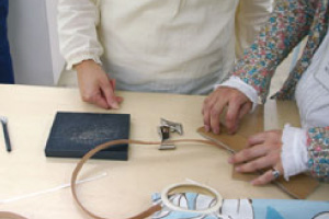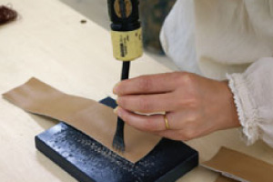 2コマ目は革に穴を開けるところからスタート。革用の穴を開ける道具を借りました。ハンマーで打ちつけて均一な間隔で穴を開けます。中心から開けるのがポイントですって。